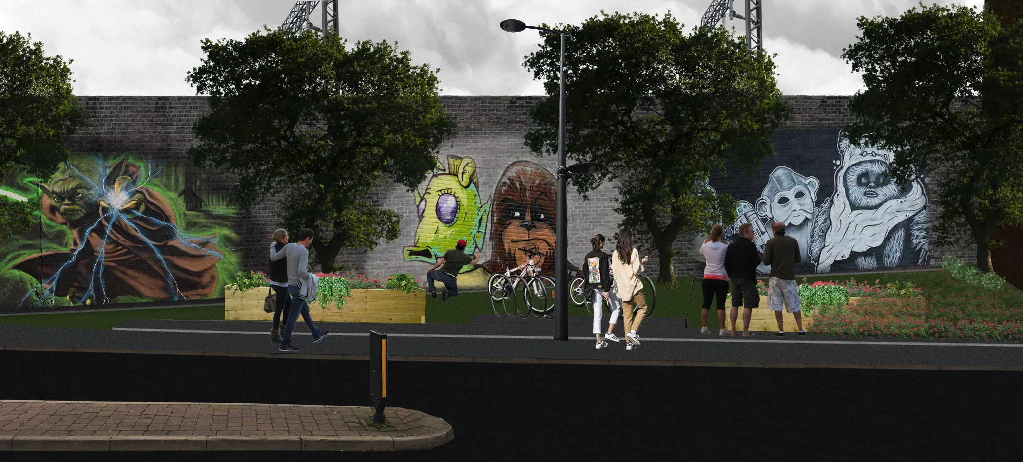 Tapestry worked with Wood Street Walls (WSW) to propose the Elliot Ashton Art Gardens in Leyton. The design concept turned an empty patch of land opposite the Heathcote and Star pub in Leytonstone into bookable art walls beside a community garden in memory of local artist, the late Elliot Ashton. The landscape and public realm plans prepared by Tapestry formed part of the Spacehive fund raising initiative to crowd source funding to deliver the project, with £5,000 also confirmed through the Mayor of London’s Greener City Fund. The Leytonstone Art Gardens project is also a collaboration between Wood Street Walls CIC & UAL Central Saint Martins Design Against Crime Unit, that aims to give artists safe places to paint in a new public community garden without fear of recrimination, whilst helping reduce the levels of CO2 within the area from the new planting. Artists will be able to book via an online portal, where photos of all the artwork will be held for the public to see. Permission for the space has been granted by both Waltham Forest Council and Network Rail who own the green space and arches respectively.